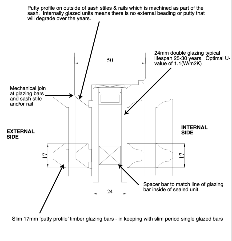 Additionally, Sashed offers a range of specialist slimline double glazing, single glazing, and authentic ‘hand-drawn’ historical glass, all specifically designed to complement solid glazing bars. These options ensure your windows achieve a genuine period appearance while meeting modern performance standards.