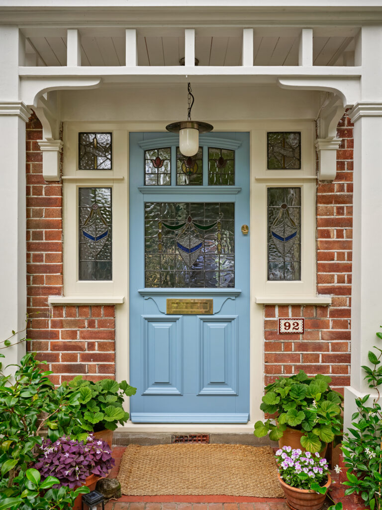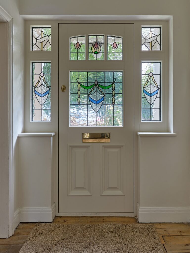 The project focused on preserving the home’s original stained glass; a colourful period feature Claire wanted to keep. Sashed carefully removed the panels from both the existing door and windows and entrusted them to stained-glass artist Zoe Angle of Angle Glass, who refurbished and resized them for seamless integration into the joinery. To complement the design, Zoe also crafted new bespoke sidelights for the doors that echo and extend the stained-glass motifs, resulting in a cohesive and vibrant entrance.